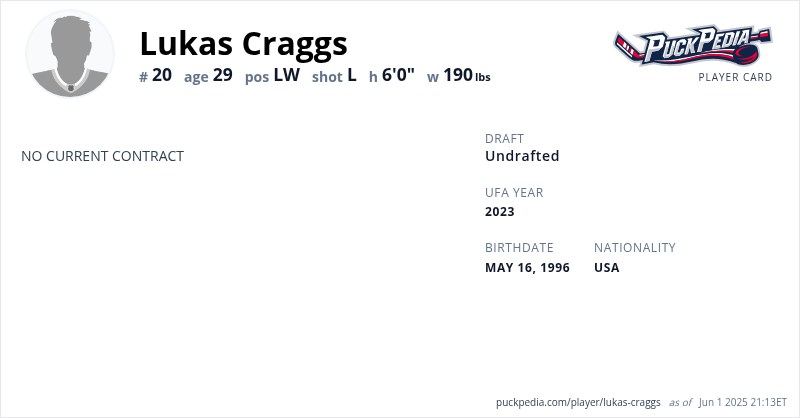 Lukas Craggs is an Unrestricted Free Agent (No Qualifying Offer). His last contract was 2 years, $1,850,000 with a cap hit of $925,000 per season. It expired at the end of the 2020-21 season.