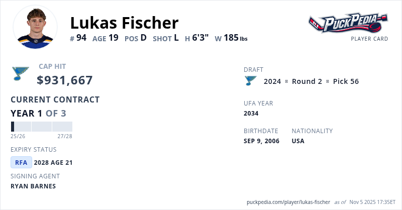 Lukas Fischer is signed to a 3 year, $2,795,001 contract with a cap hit of $931,667 per season, playing for the St. Louis Blues. His contract expires at the end of the 2027-28 season, making Fischer a Restricted Free Agent.