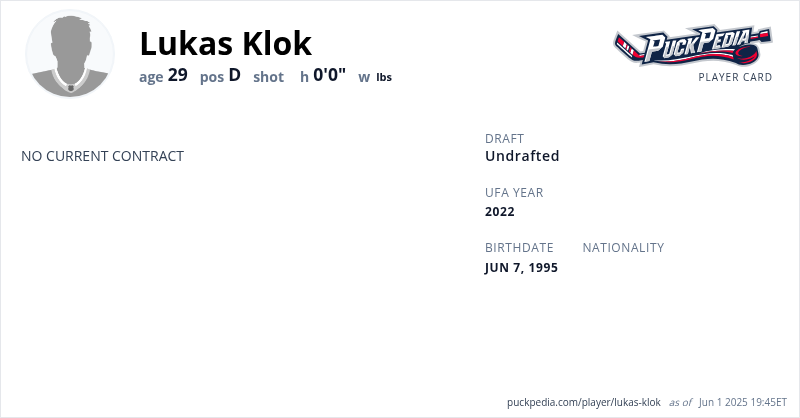Lukas Klok is an Unrestricted Free Agent. His last contract was 1 year, $845,000 with a cap hit of $845,000 per season. It expired at the end of the 2022-23 season.