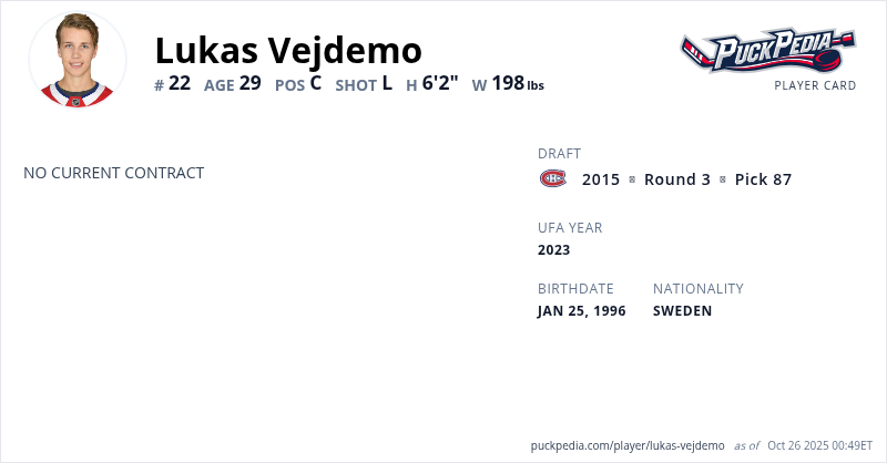 Lukas Vejdemo is an Unrestricted Free Agent. His last contract was 1 year, $750,000 with a cap hit of $750,000 per season. It expired at the end of the 2021-22 season.