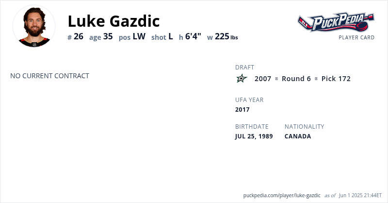 Luke Gazdic is an Unrestricted Free Agent. His last contract was 1 year, $650,000 with a cap hit of $650,000 per season. It expired at the end of the 2017-18 season.