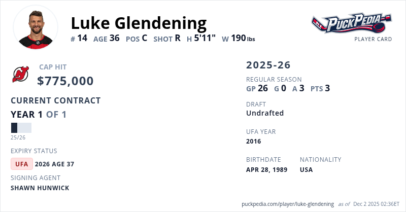 Luke Glendening is signed to a 1 year, $775,000 contract with a cap hit of $775,000 per season, playing for the New Jersey Devils. His contract expires at the end of the 2025-26 season, making Glendening an Unrestricted Free Agent.
