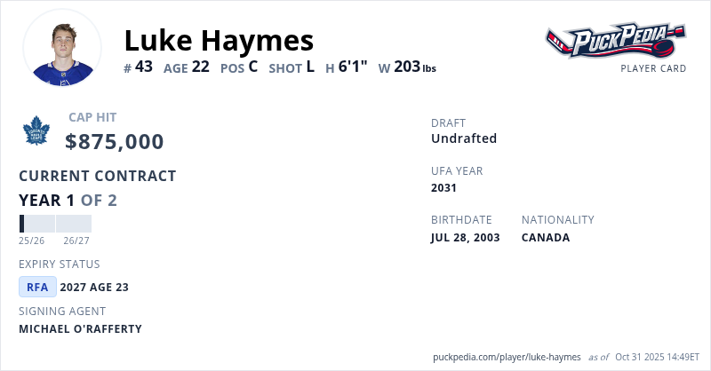 Luke Haymes is signed to a 2 year, $1,750,000 contract with a cap hit of $875,000 per season, playing for the Toronto Maple Leafs. His contract expires at the end of the 2026-27 season, making Haymes a Restricted Free Agent.