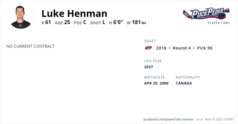Luke Henman is an Unrestricted Free Agent (Group 6). His last contract was 1 year, $775,000 with a cap hit of $775,000 per season. It expired at the end of the 2024-25 season.