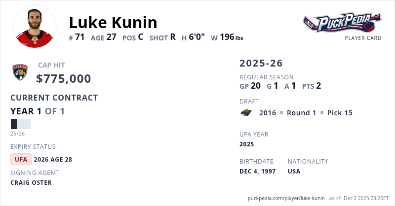 Luke Kunin is signed to a 1 year, $775,000 contract with a cap hit of $775,000 per season, playing for the Florida Panthers. His contract expires at the end of the 2025-26 season, making Kunin an Unrestricted Free Agent.