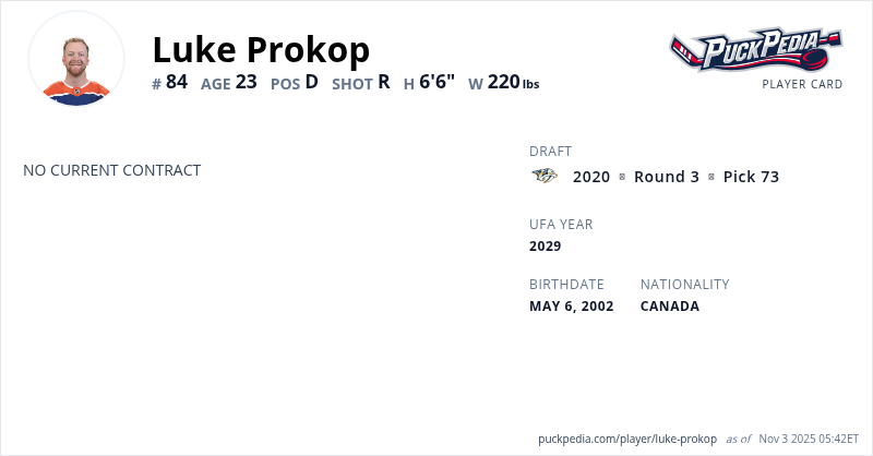 Luke Prokop is an Unrestricted Free Agent (No Qualifying Offer). His last contract was 3 years, $2,379,999 with a cap hit of $793,333 per season. It expired at the end of the 2024-25 season.