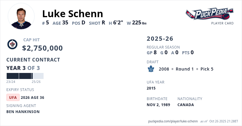 Luke Schenn is signed to a 3 year, $8,250,000 contract with a cap hit of $2,750,000 per season, playing for the Winnipeg Jets. His contract expires at the end of the 2025-26 season, making Schenn an Unrestricted Free Agent.