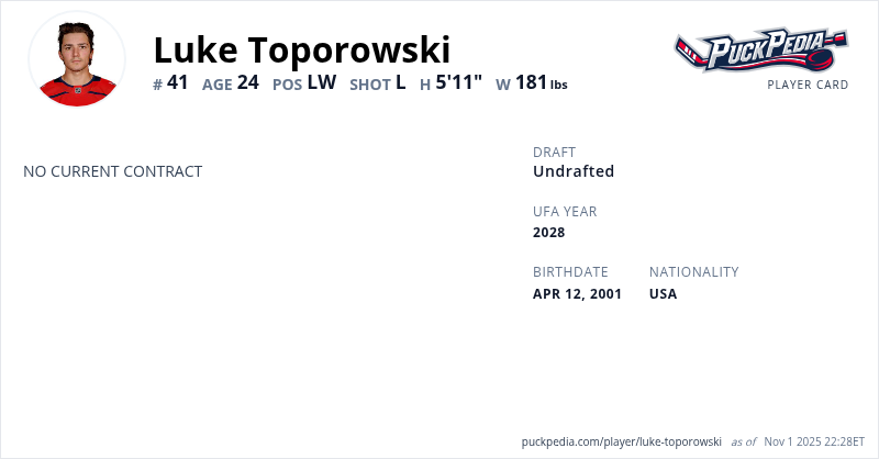 Luke Toporowski is an Unrestricted Free Agent (No Qualifying Offer). His last contract was 2 years, $1,740,000 with a cap hit of $870,000 per season. It expired at the end of the 2024-25 season.