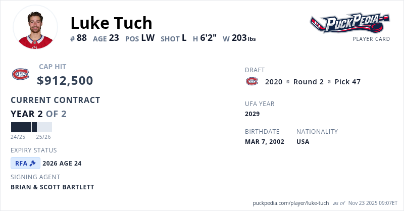 Luke Tuch is signed to a 2 year, $1,825,000 contract with a cap hit of $912,500 per season, playing for the Montreal Canadiens. His contract expires at the end of the 2025-26 season, making Tuch a Restricted Free Agent.