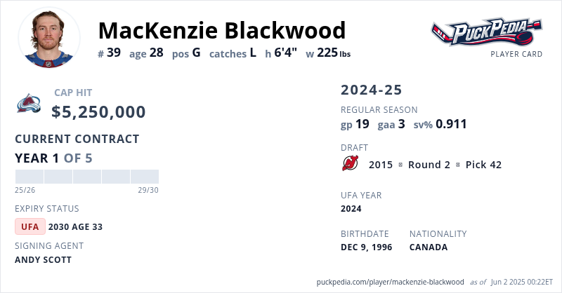 MacKenzie Blackwood is signed to a 5 year, $26,250,000 contract with a cap hit of $5,250,000 per season, playing for the Colorado Avalanche. His contract expires at the end of the 2029-30 season, making Blackwood an Unrestricted Free Agent.