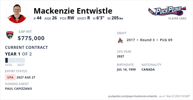 Mackenzie Entwistle is signed to a 2 year, $1,550,000 contract with a cap hit of $775,000 per season, playing for the Florida Panthers. His contract expires at the end of the 2026-27 season, making Entwistle an Unrestricted Free Agent.