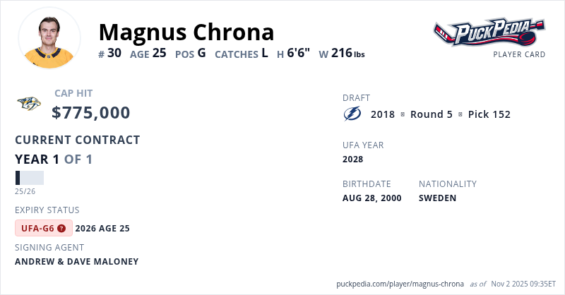 Magnus Chrona is signed to a 1 year, $775,000 contract with a cap hit of $775,000 per season, playing for the Nashville Predators. His contract expires at the end of the 2025-26 season, making Chrona an Unrestricted Free Agent (Group 6).