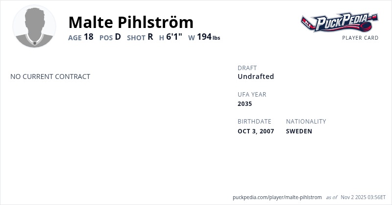 | 2024-25 | 17 | U18 Nationell | Färjestad BK U18 | 10 | 2 | 6 | 8 | 31 | Playoffs | 3 | 0 | 0 | 0 | 0 | ||||||||||||||||