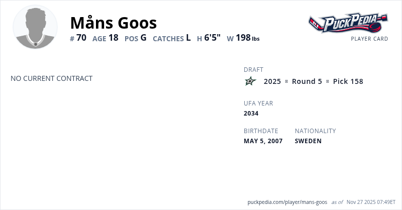 | 2025-26 | 18 | International-Jr | Sweden U20 (all) | 2 | 4.51 | 0.845 | 0 | |||||||||||||||||||||||