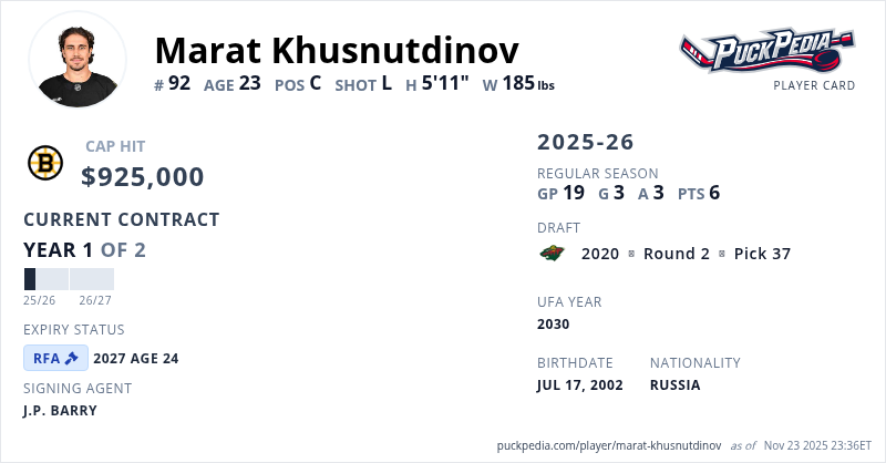 Marat Khusnutdinov is signed to a 2 year, $1,850,000 contract with a cap hit of $925,000 per season, playing for the Boston Bruins. His contract expires at the end of the 2026-27 season, making Khusnutdinov a Restricted Free Agent.