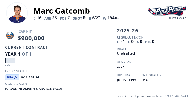Marc Gatcomb is signed to a 1 year, $900,000 contract with a cap hit of $900,000 per season, playing for the New York Islanders. His contract expires at the end of the 2025-26 season, making Gatcomb a Restricted Free Agent.