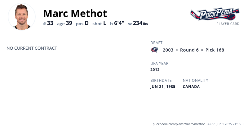 Marc Methot is an Unrestricted Free Agent. His last contract was 4 years, $19,600,000 with a cap hit of $4,900,000 per season. It expired at the end of the 2018-19 season.