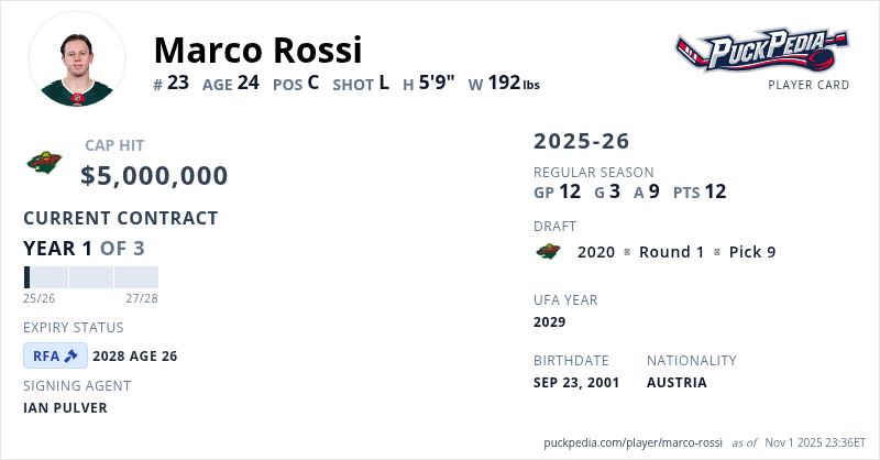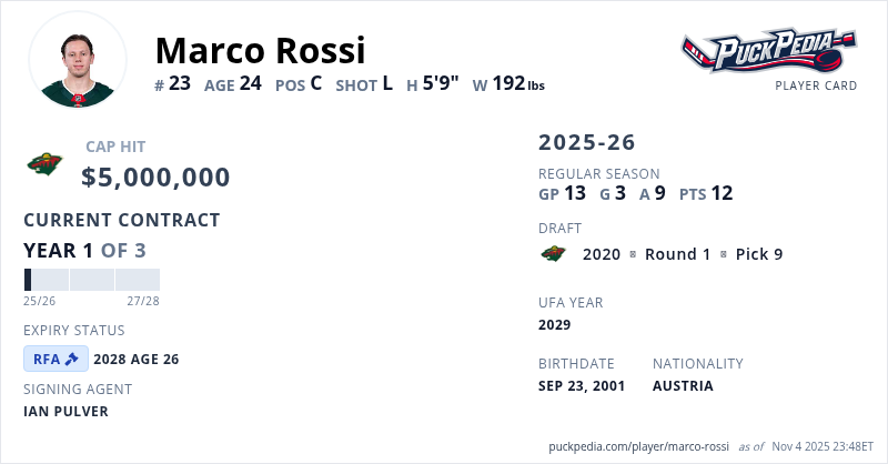 Marco Rossi is signed to a 3 year, $15,000,000 contract with a cap hit of $5,000,000 per season, playing for the Minnesota Wild. His contract expires at the end of the 2027-28 season, making Rossi a Restricted Free Agent.