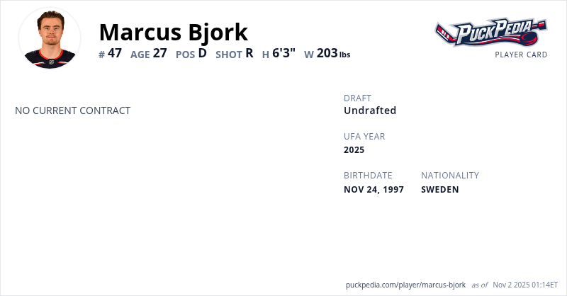 Marcus Bjork is an Unrestricted Free Agent (No Qualifying Offer). His last contract was 1 year, $775,000 with a cap hit of $775,000 per season. It expired at the end of the 2023-24 season.