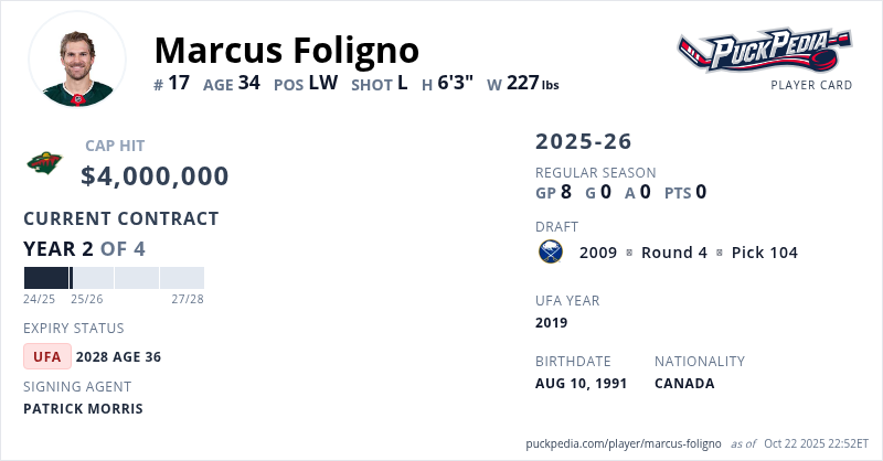 Marcus Foligno is signed to a 4 year, $16,000,000 contract with a cap hit of $4,000,000 per season, playing for the Minnesota Wild. His contract expires at the end of the 2027-28 season, making Foligno an Unrestricted Free Agent.