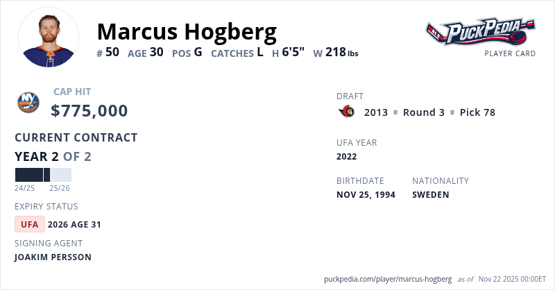Marcus Hogberg is signed to a 2 year, $1,550,000 contract with a cap hit of $775,000 per season, playing for the New York Islanders. His contract expires at the end of the 2025-26 season, making Hogberg an Unrestricted Free Agent.