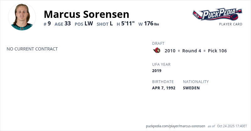 Marcus Sorensen is an Unrestricted Free Agent. His last contract was 2 years, $3,000,000 with a cap hit of $1,500,000 per season. It expired at the end of the 2020-21 season.