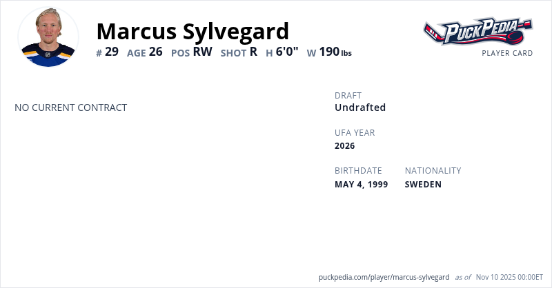 Marcus Sylvegard is a Restricted Free Agent. His last contract was 1 year, $870,000 with a cap hit of $870,000 per season.