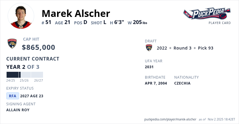Marek Alscher is signed to a 3 year, $2,595,000 contract with a cap hit of $865,000 per season, playing for the Florida Panthers. His contract expires at the end of the 2026-27 season, making Alscher a Restricted Free Agent.