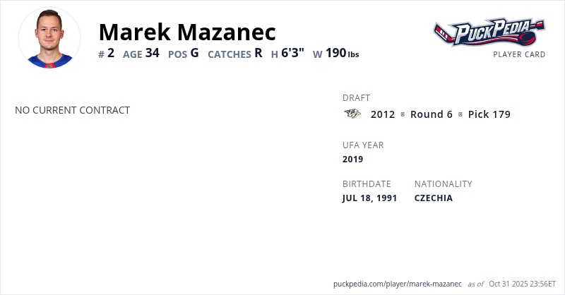 Marek Mazanec is an Unrestricted Free Agent. His last contract was 1 year, $650,000 with a cap hit of $650,000 per season. It expired at the end of the 2018-19 season.