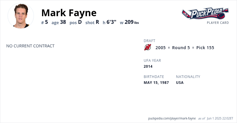 Mark Fayne is an Unrestricted Free Agent. His last contract was 4 years, $14,500,000 with a cap hit of $3,625,000 per season. It expired at the end of the 2017-18 season.