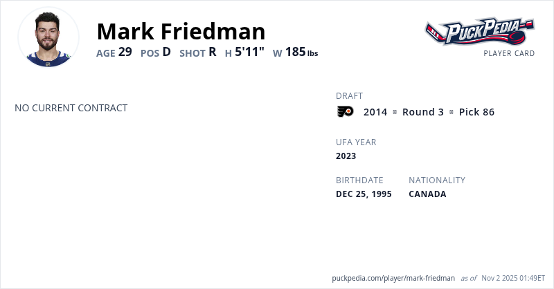 Mark Friedman is an Unrestricted Free Agent. His last contract was 1 year, $775,000 with a cap hit of $775,000 per season. It expired at the end of the 2024-25 season.