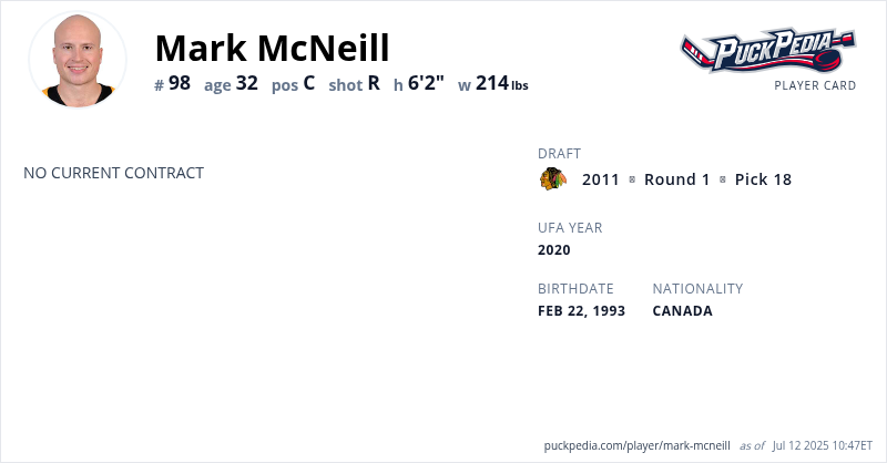 Mark McNeill is an Unrestricted Free Agent. His last contract was 1 year, $650,000 with a cap hit of $650,000 per season. It expired at the end of the 2018-19 season.