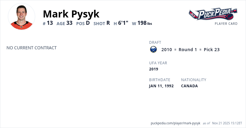Mark Pysyk is an Unrestricted Free Agent. His last contract was 1 year, $775,000 with a cap hit of $775,000 per season. It expired at the end of the 2023-24 season.