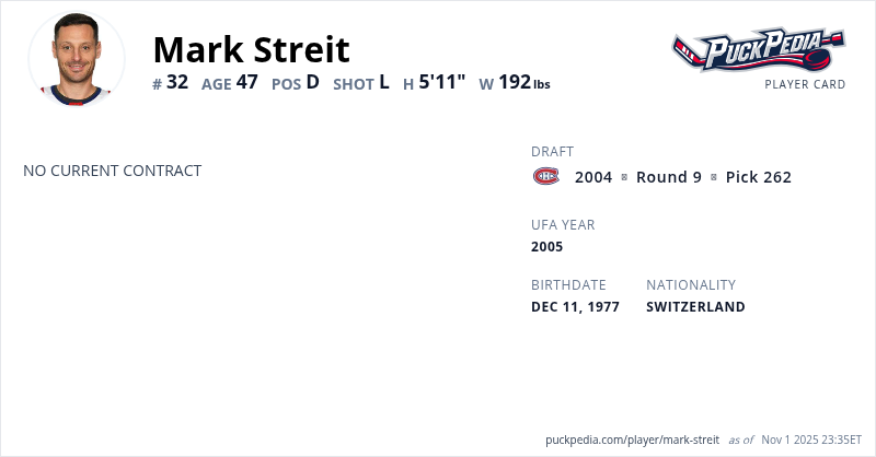 | 2005-06 | 28 | NHL | Montréal Canadiens | 48 | 2 | 9 | 11 | 28 | Playoffs | 1 | 0 | 0 | 0 | 0 | ||||||||||||||||