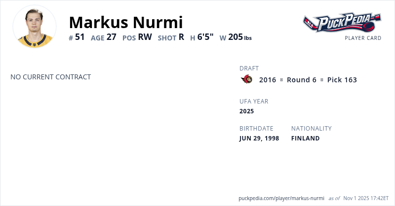 Markus Nurmi is an Unrestricted Free Agent (No Qualifying Offer). His last contract was 1 year, $842,500 with a cap hit of $842,500 per season. It expired at the end of the 2022-23 season.