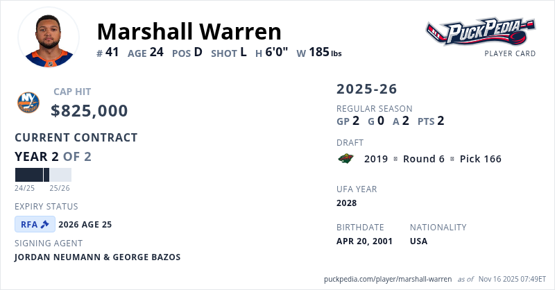 Marshall Warren is signed to a 2 year, $1,650,000 contract with a cap hit of $825,000 per season, playing for the New York Islanders. His contract expires at the end of the 2025-26 season, making Warren a Restricted Free Agent.