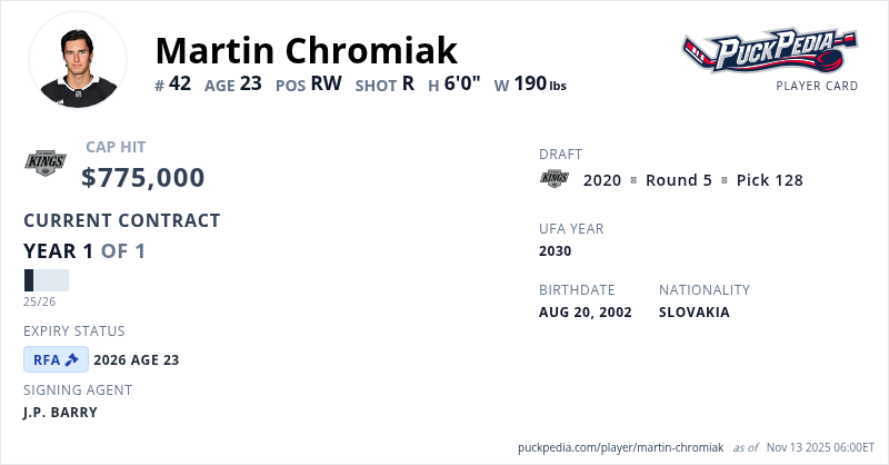 Martin Chromiak is signed to a 1 year, $775,000 contract with a cap hit of $775,000 per season, playing for the Los Angeles Kings. His contract expires at the end of the 2025-26 season, making Chromiak a Restricted Free Agent.