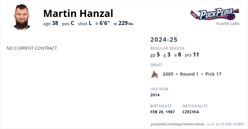 Martin Hanzal is an Unrestricted Free Agent. His last contract was 3 years, $14,250,000 with a cap hit of $4,750,000 per season. It expired at the end of the 2019-20 season.