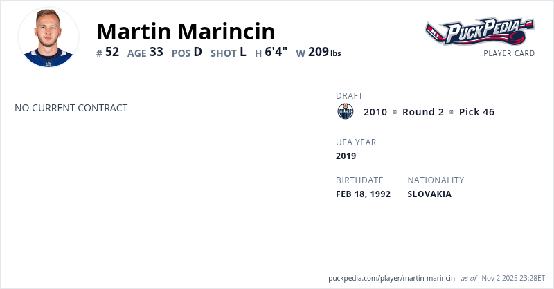 Martin Marincin is an Unrestricted Free Agent. His last contract was 1 year, $700,000 with a cap hit of $700,000 per season. It expired at the end of the 2020-21 season.