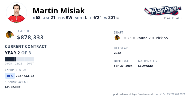 Martin Misiak is signed to a 3 year, $2,634,999 contract with a cap hit of $878,333 per season, playing for the Chicago Blackhawks. His contract expires at the end of the 2026-27 season, making Misiak a Restricted Free Agent.