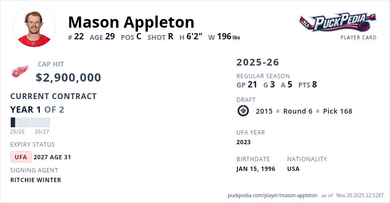 Mason Appleton is signed to a 2 year, $5,800,000 contract with a cap hit of $2,900,000 per season, playing for the Detroit Red Wings. His contract expires at the end of the 2026-27 season, making Appleton an Unrestricted Free Agent.