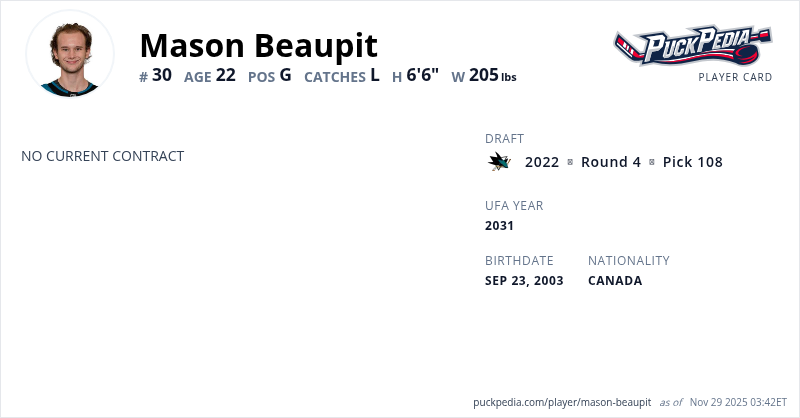| 2022-23 | 19 | WHL | Wenatchee Wild | 22 | 3.08 | 0.892 | 0 | Playoffs | 3 | 2.91 | 0.861 | 0 | ||||||||||||||||||