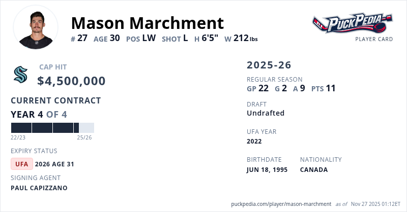 Mason Marchment is signed to a 4 year, $18,000,000 contract with a cap hit of $4,500,000 per season, playing for the Seattle Kraken. His contract expires at the end of the 2025-26 season, making Marchment an Unrestricted Free Agent.