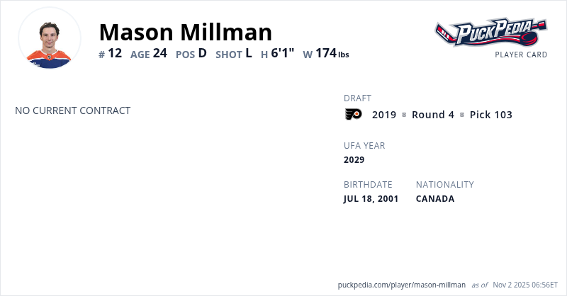 Mason Millman is an Unrestricted Free Agent (No Qualifying Offer). His last contract was 3 years, $2,454,999 with a cap hit of $818,333 per season. It expired at the end of the 2023-24 season.