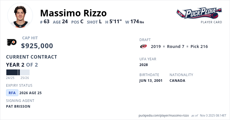 Massimo Rizzo is signed to a 2 year, $1,850,000 contract with a cap hit of $925,000 per season, playing for the Philadelphia Flyers. His contract expires at the end of the 2025-26 season, making Rizzo a Restricted Free Agent.