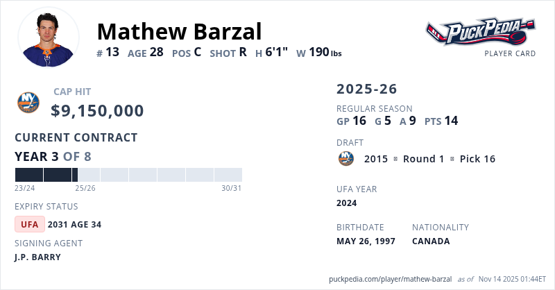 Mathew Barzal is signed to a 8 year, $73,200,000 contract with a cap hit of $9,150,000 per season, playing for the New York Islanders. His contract expires at the end of the 2030-31 season, making Barzal an Unrestricted Free Agent.