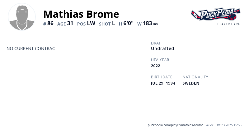 Mathias Brome is an Unrestricted Free Agent (No Qualifying Offer). His last contract was 1 year, $925,000 with a cap hit of $925,000 per season. It expired at the end of the 2020-21 season.