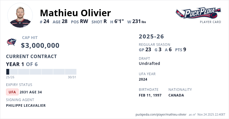 Mathieu Olivier is signed to a 6 year, $18,000,000 contract with a cap hit of $3,000,000 per season, playing for the Columbus Blue Jackets. His contract expires at the end of the 2030-31 season, making Olivier an Unrestricted Free Agent.