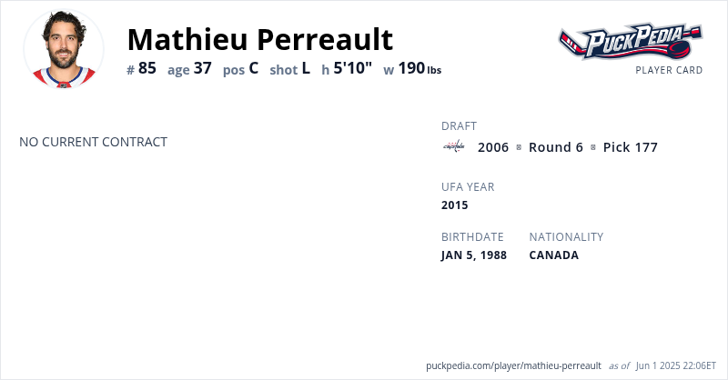 Mathieu Perreault is an Unrestricted Free Agent. His last contract was 1 year, $950,000 with a cap hit of $950,000 per season. It expired at the end of the 2021-22 season.