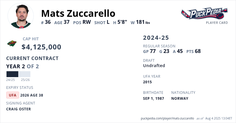Mats Zuccarello is signed to a 2 year, $8,250,000 contract with a cap hit of $4,125,000 per season, playing for the Minnesota Wild. His contract expires at the end of the 2025-26 season, making Zuccarello an Unrestricted Free Agent.